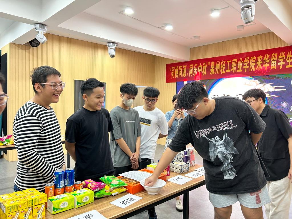 随后,是“国家级非物质文化遗产——海丝民俗中秋博饼”环节。骰子在瓷碗中叮当响,骰子声、欢呼声、喝彩声,现场氛围高潮迭起,大家都卯足了劲儿。经过一轮又一轮的比拼,“一秀”“二举”人人皆有收获。“状元!状元!”当来自马来西亚的刘宏杰同学掷出状元点数时,大家为他欢呼庆祝。现场热闹非凡,大家自然而然地融入热烈的中秋节日氛围里。